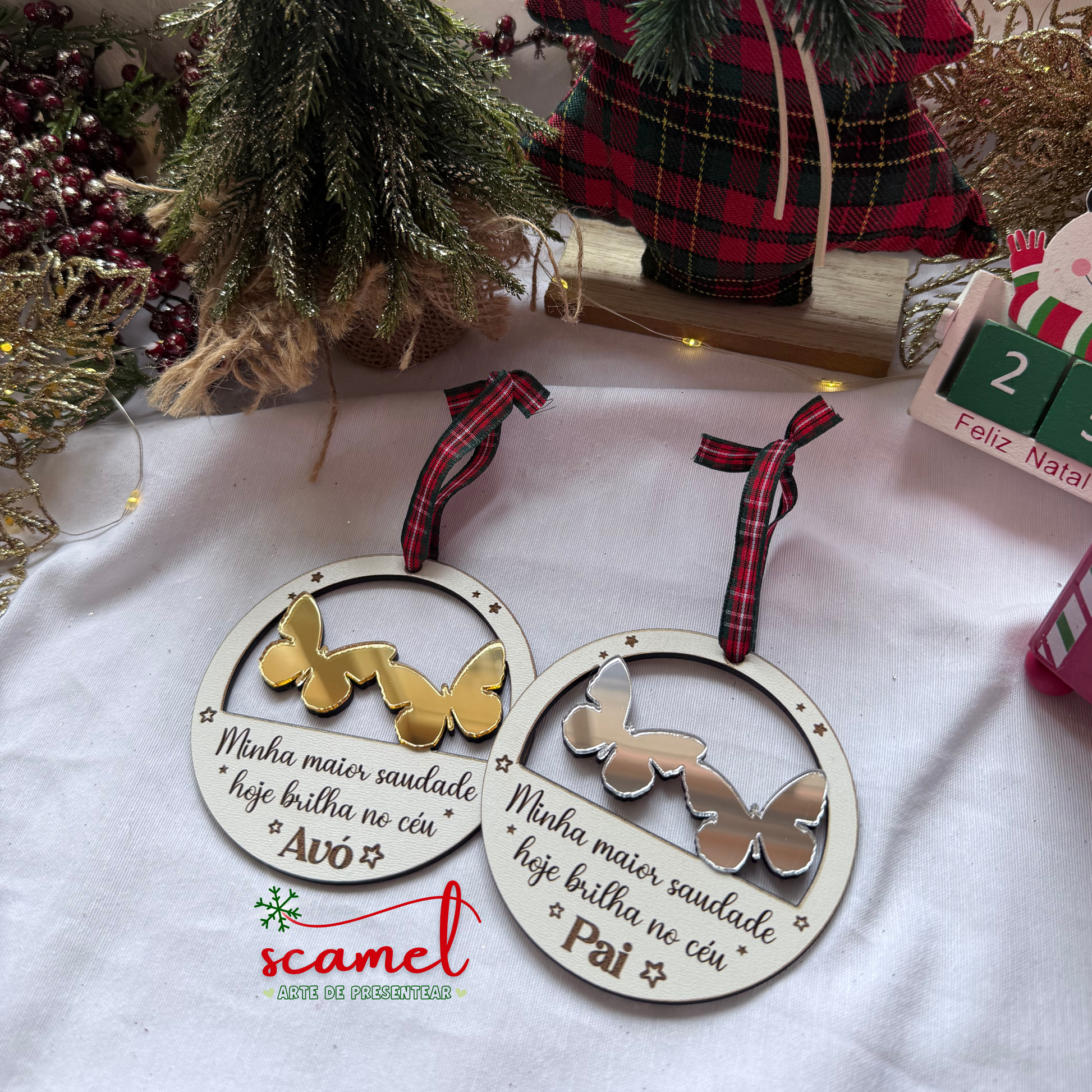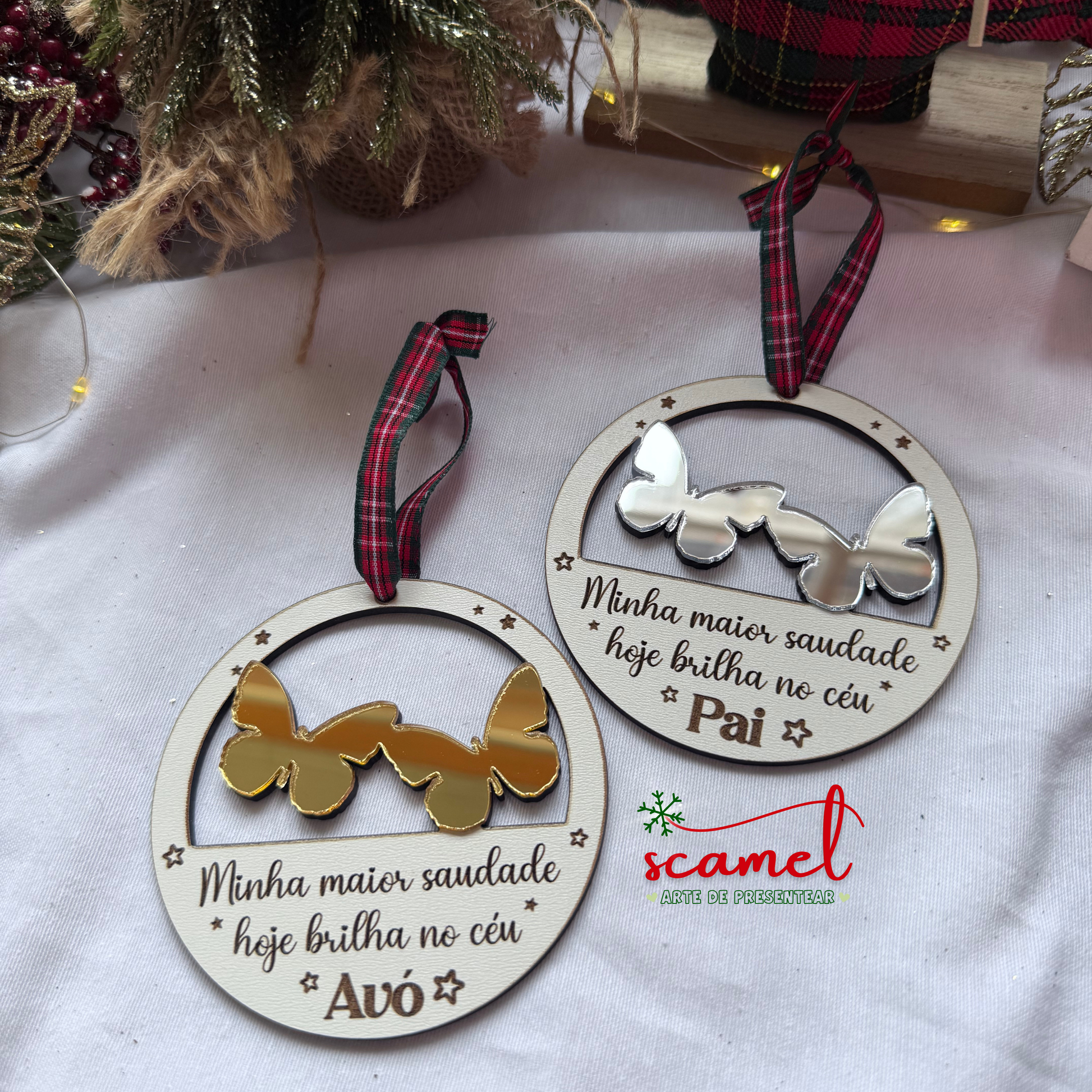 Este ornamento combina a beleza de um texto cheio de significado com delicadas borboletas douradas ou prateadas, criando uma peça única e emocionante para a tua árvore de Natal.