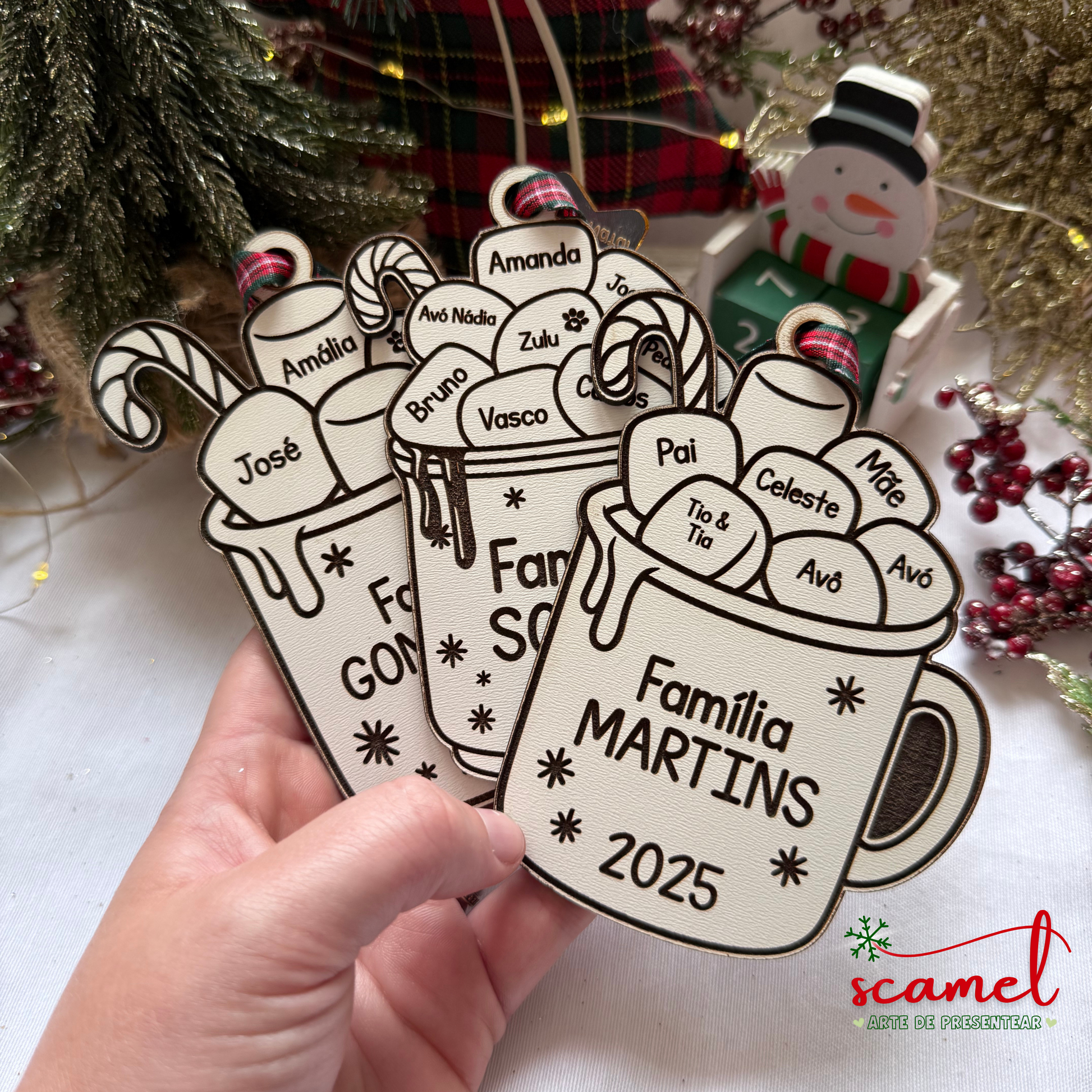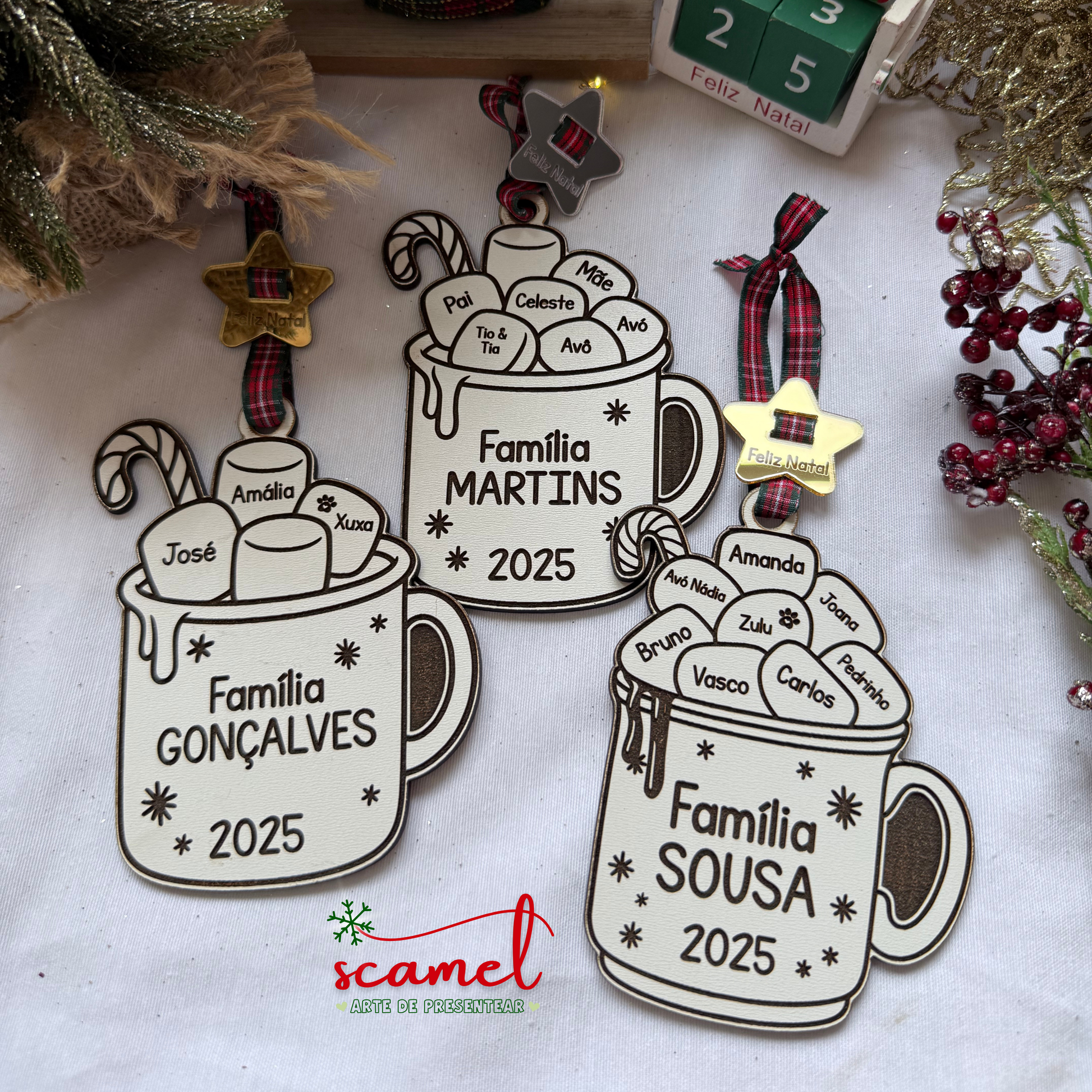 Este ornamento encantador em forma de copo de chocolate quente é puro aconchego natalício! Cada marshmallow pode ser personalizado com o nome de um membro da família — uma forma deliciosa de celebrar quem faz parte dos teus melhores momentos.