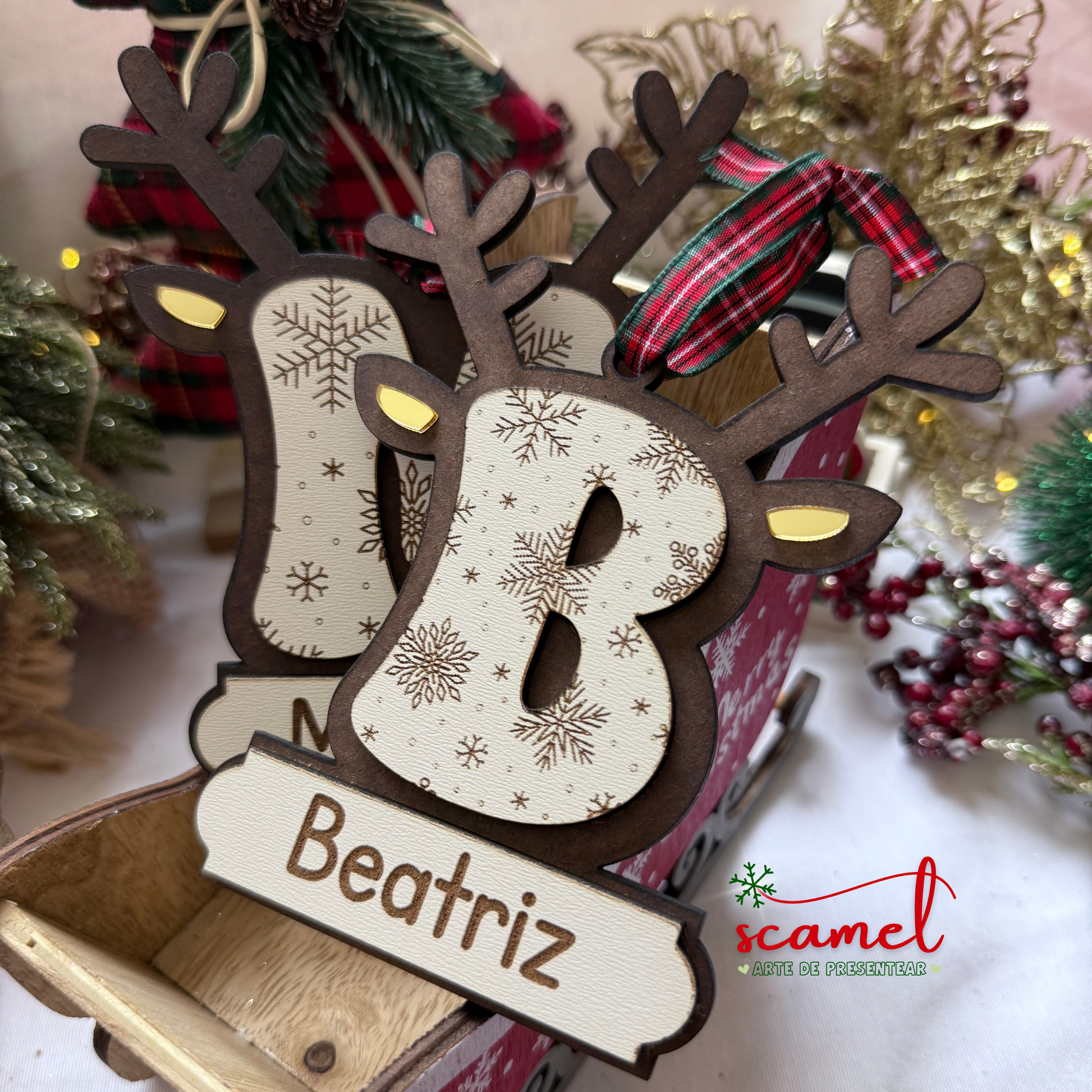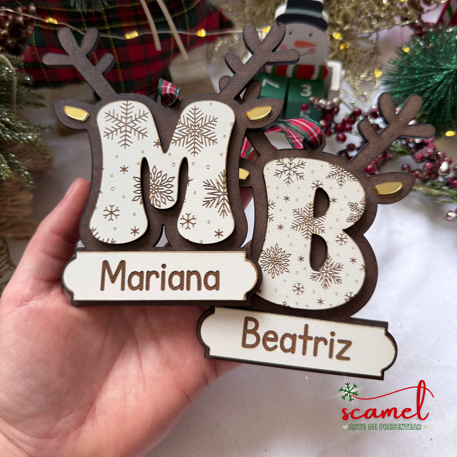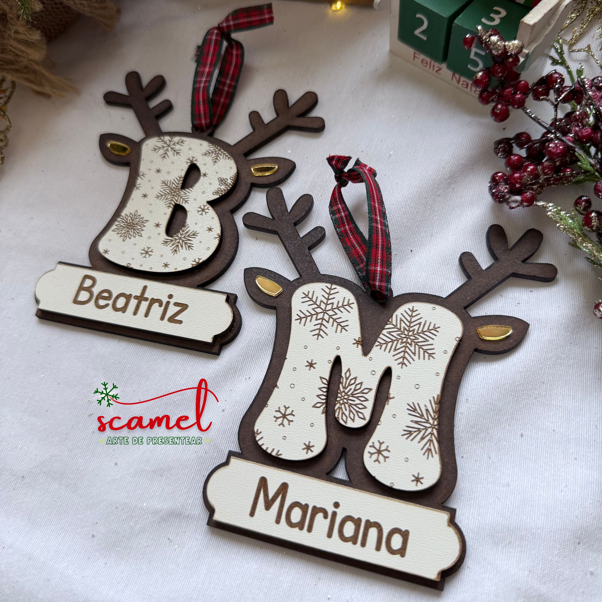 Cada ornamento vem em formato de rena, com um elegante padrão de flocos de neve e detalhes dourados que brilham como a magia do Natal. Perfeito para escolher a letra que te representa, um nome especial ou até uma palavra querida!
